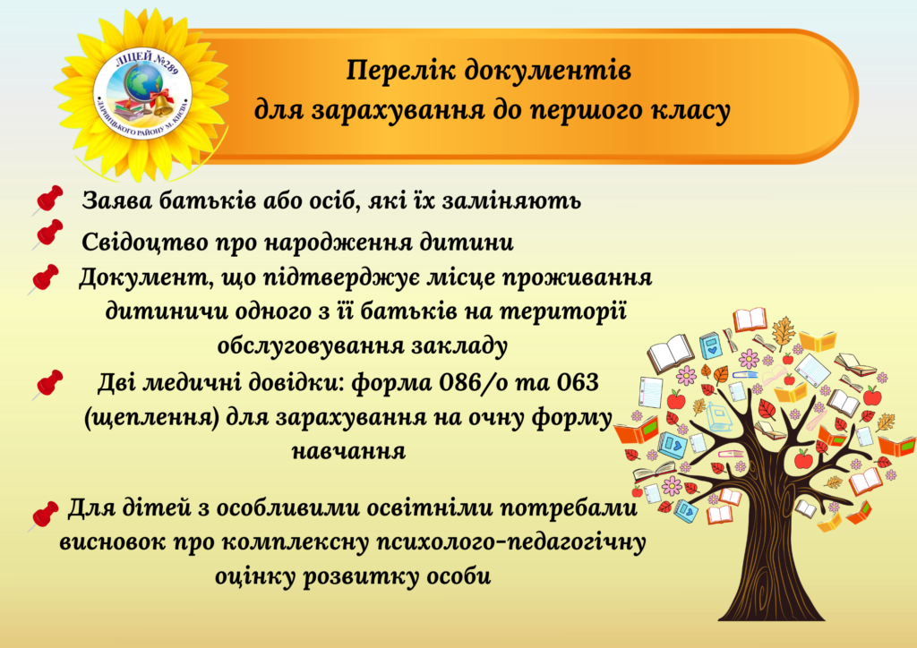 Зазначені документи можна надати в години прийому власноруч або в електронному вигляді через інформаційно-комунікаційну систему «Програмна платформа для електронних послуг, у тому числі адміністративних». https://portal.kyiv.digital/service/first-school